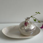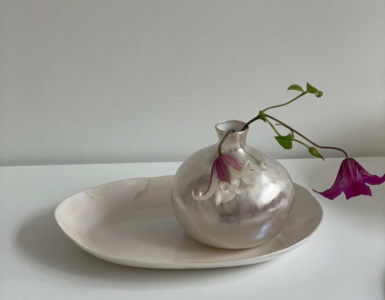Hand-crafted from porcelain and pure silver, Heami Lee’s Silver Vases are distinguished by their intricate texture and shimmering, radiant finish. The Silver branch vase begins as unglazed porcelain, which the artist bisque fires at her studio and showroom in Seoul, South Korea. She then coats the piece in pure silver, fires it again, and polishes it by hand. This process is repeated three to four times to achieve the lustrous, glimmering finish—designed to age gracefully and develop a rich, natural patina over time.