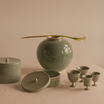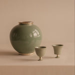 Crafted from chungja (celadon) and accented with silver, this piece radiates sophistication while carrying deep cultural symbolism. In Korean tradition, the moonjar is a timeless emblem of harmony, wholeness, and good fortune—making it a meaningful gift or treasured addition to any collection.