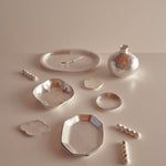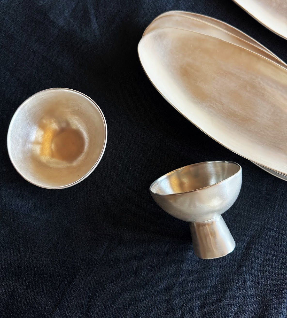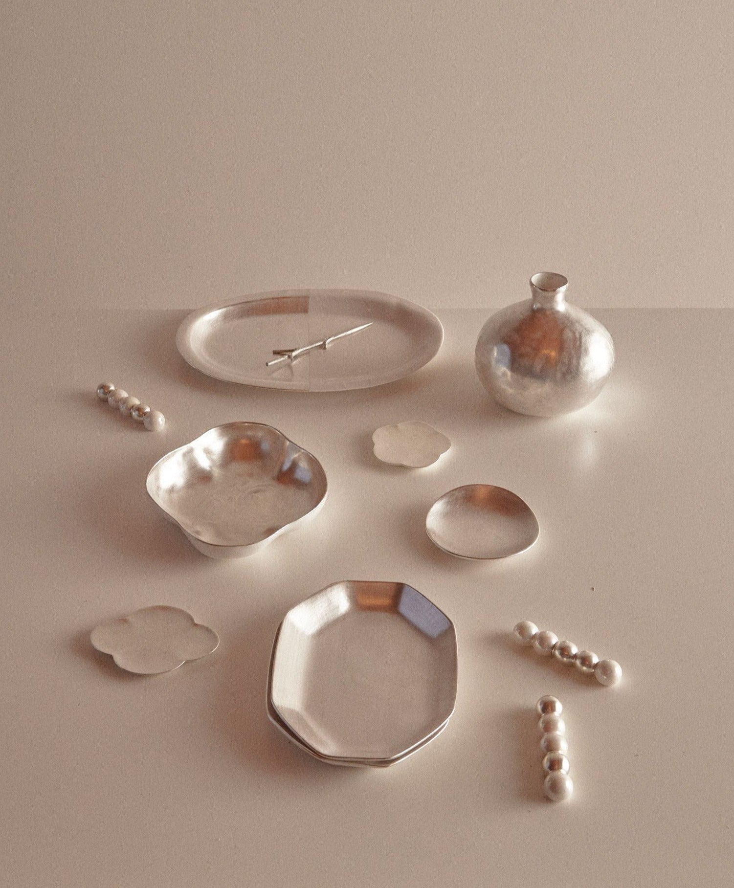 Heami Lee’s Silver High Bowl begins as fine, unglazed porcelain, meticulously bisque-fired in her Seoul, South Korea studio. Each piece is then coated in pure silver, fired once more, and hand-polished to a radiant sheen. This process is repeated three to four times, creating a luminous, mirror-like surface designed to age with grace—developing a rich, organic patina that tells its own story over time.