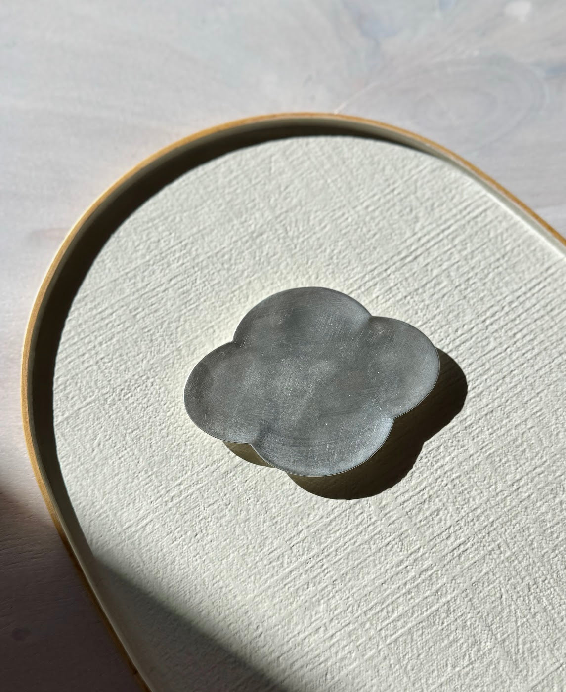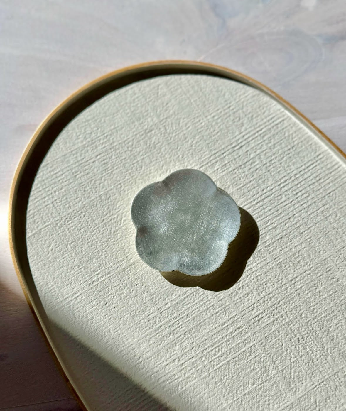 Designed by Corean artist EunSeam Jo, this petit silver plate is crafted by hand to add a punctuation mark of style to your table. Petit silver plate finished in pure silver. Use as a considered plate for any delicacies or jewelry or style solo as a simple, spirited object. Handmade designs are one of a kind and will feature slight variations.