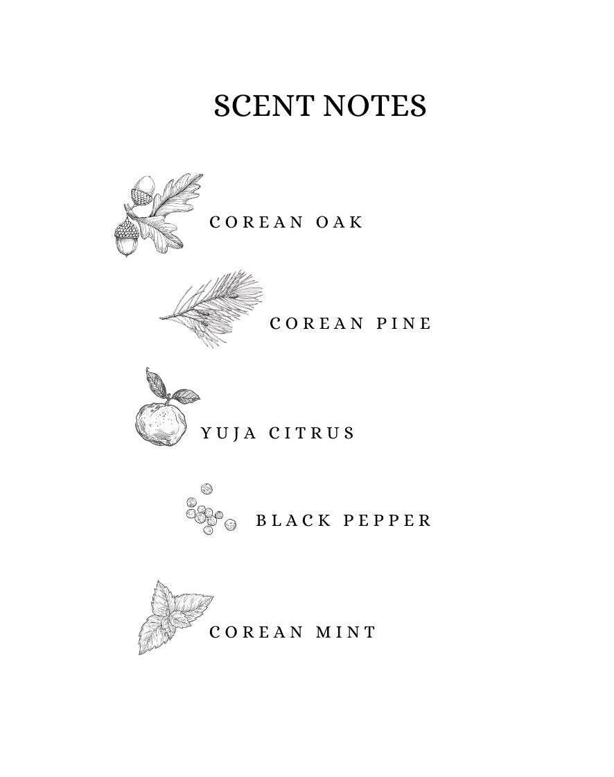 Serene, grounded and harmonious is the inspiration behind Moonlight Serenity. Notes of Korean oak, intertwined with fresh Korean mint, yuja citrus, transforms into dry accord finish with black pepper. Ideal for meditation, tea ceremonies, or quiet reflection to harmonize your space.